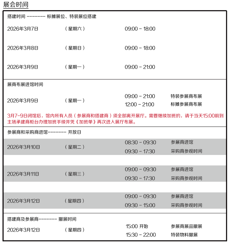 3月7-9日(布展期间)、3月12日(撤展期间)每天15:00前在主场承建商柜台申请并缴纳费用,超时申请加班则按照费用15000元/500㎡/23点前结束。